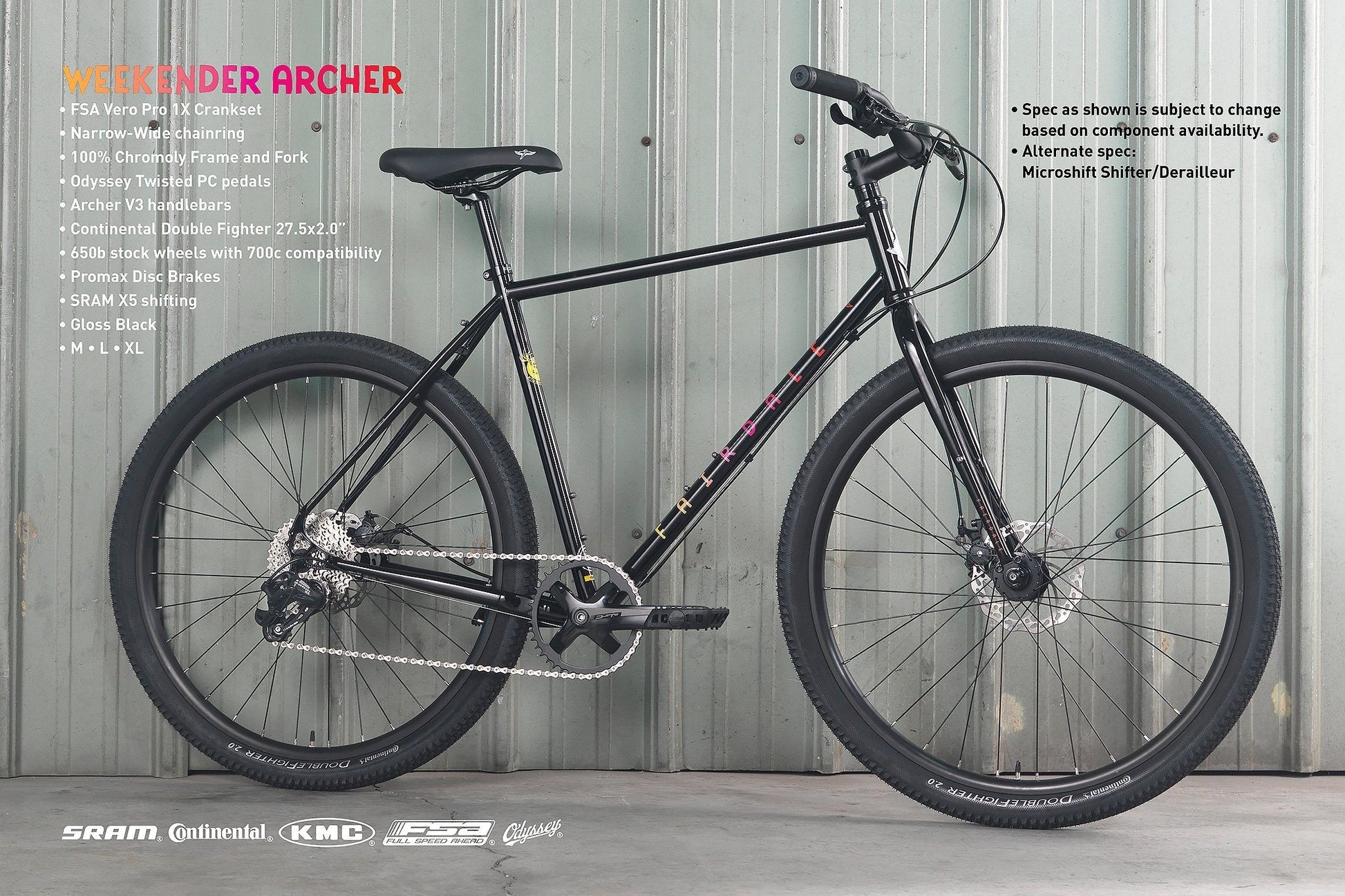 The Weekender has a redesigned geometry to work with 27.5 x 2.0” tires, and also leaves plenty of space for compatibility with 700c wheels if you ever feel like changing it up.