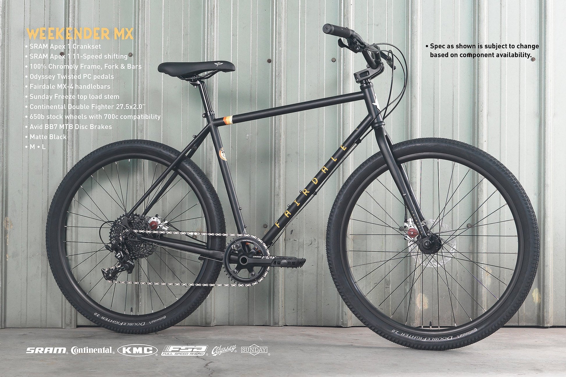 The Weekender MX's 100% 4130 chromoly frame and fork will welcome virtually anything that you can throw at it. This is Fairdales top of the line Weekender, and it comes equipped with an amazing parts build, like a SRAM Apex 1x derailleur and shifter, Avid disc brakes, FSA cranks and Continental semi-knobby tyres.
