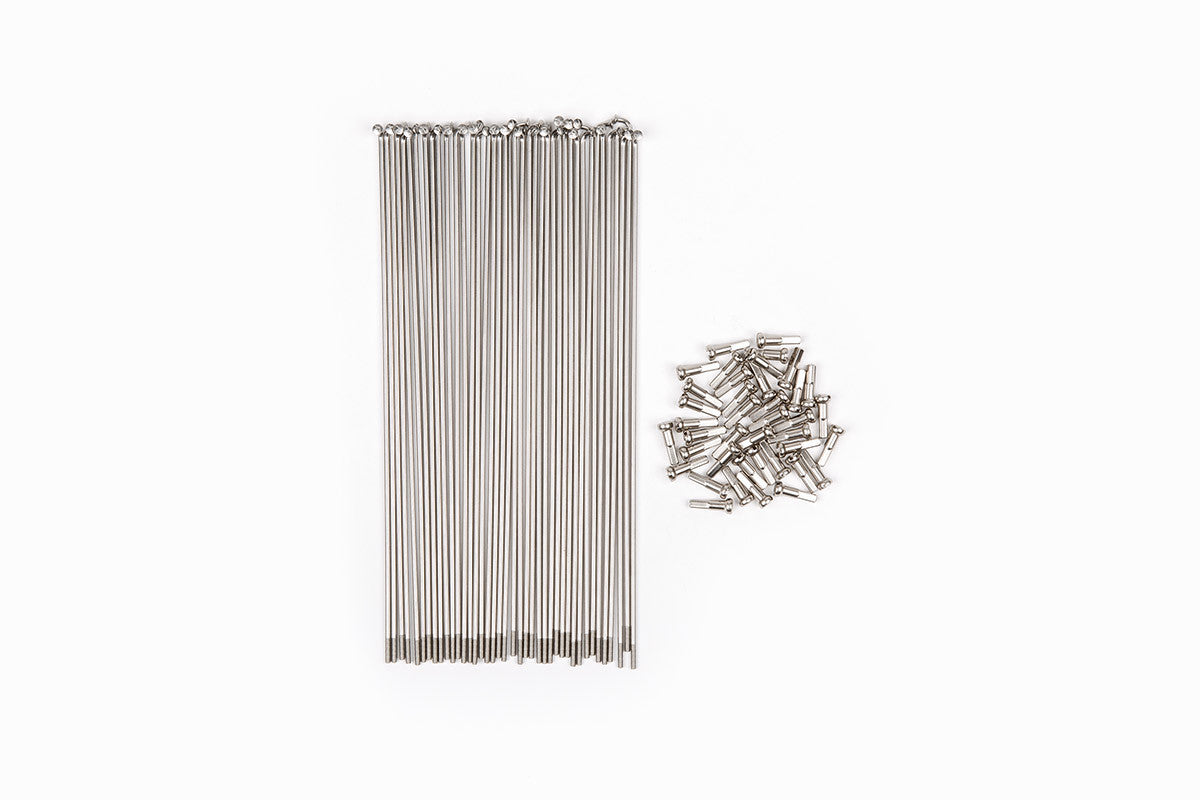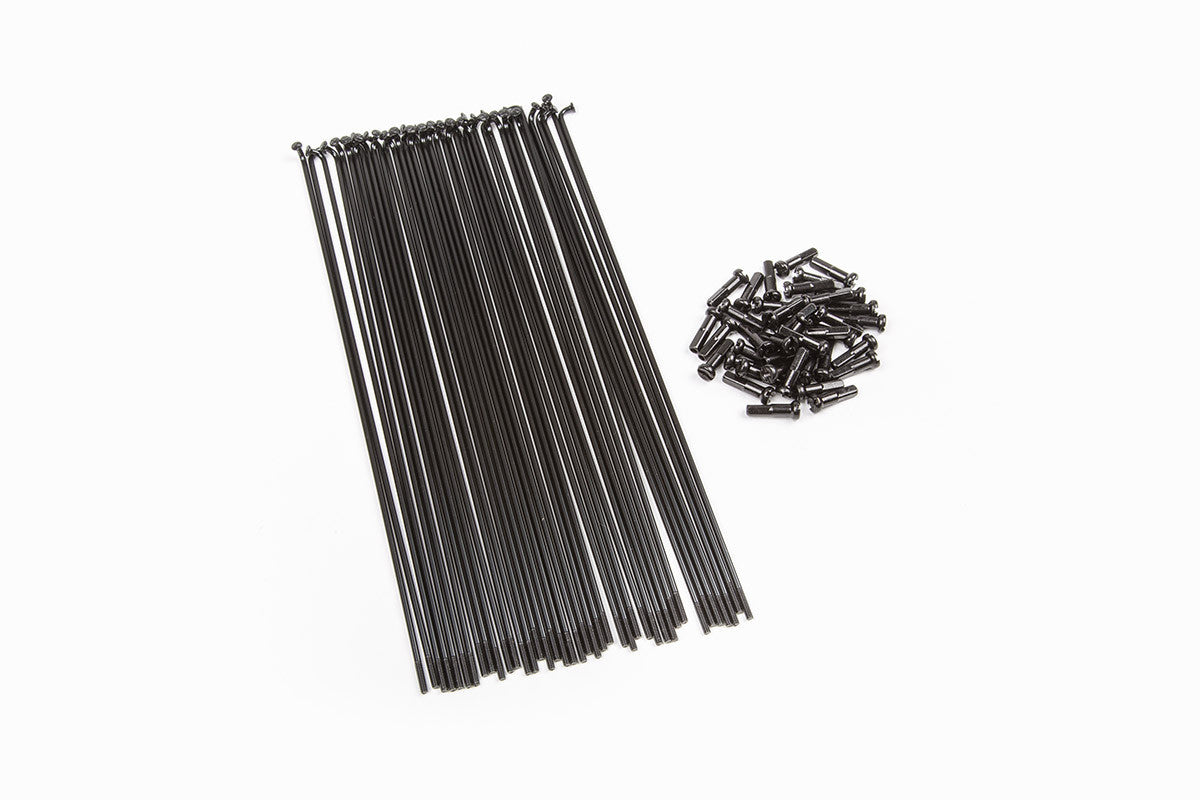 Pack of 40 stainless steel spokes and brass nipples available in black and stainless finishes.