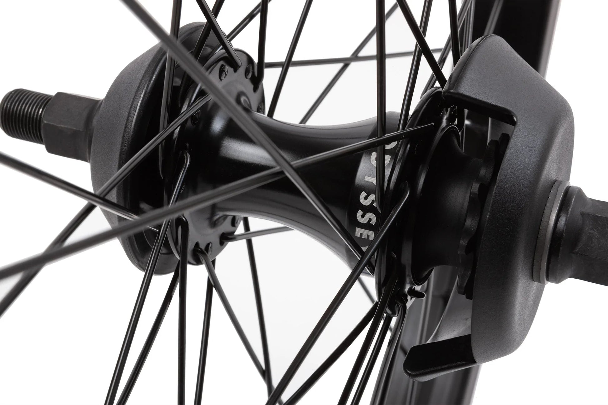 This wheel features the new Odyssey Stage 2 pinned double-walled rim laced to a sealed bearing cassette hub with a standard male axle. Drive and non-drive side guards included.