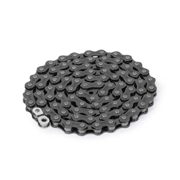 A tough, no-nonsense street chain with thicker links and tougher pins making it smooth, dependable and able to outlast anything you could put it through. Includes pre-installed half-link for perfect length adjustment.